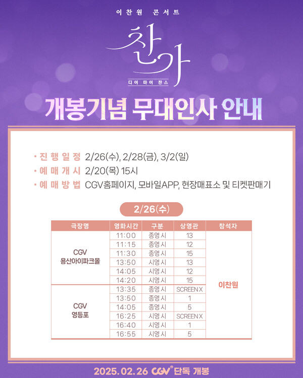 이찬원이 직접 참석하는 무대인사 일정 예매는 2025년 02월 20일(목) 오후 3시부터 시작되었습니다.